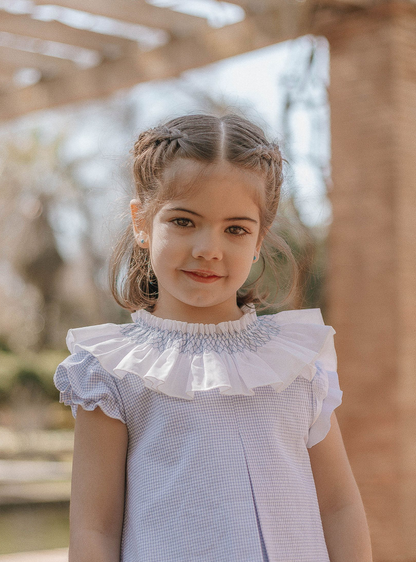 Soft, timeless, and beautifully crafted, this dress and bloomer set is made in Spain with an emphasis on traditional design and comfort. The dress features a delicate micro-check pattern in a soft blue tone, complemented by a wide ruffled collar with subtle smocking for a refined, heirloom-inspired finish. Gently fluttered sleeves and a relaxed silhouette create an effortless look that’s perfect for little ones.