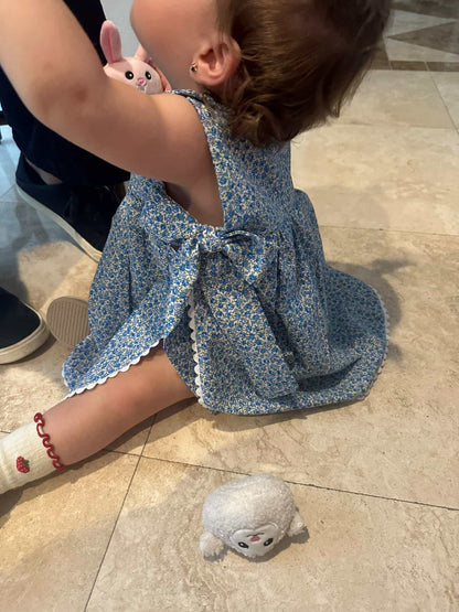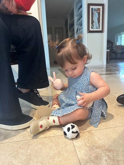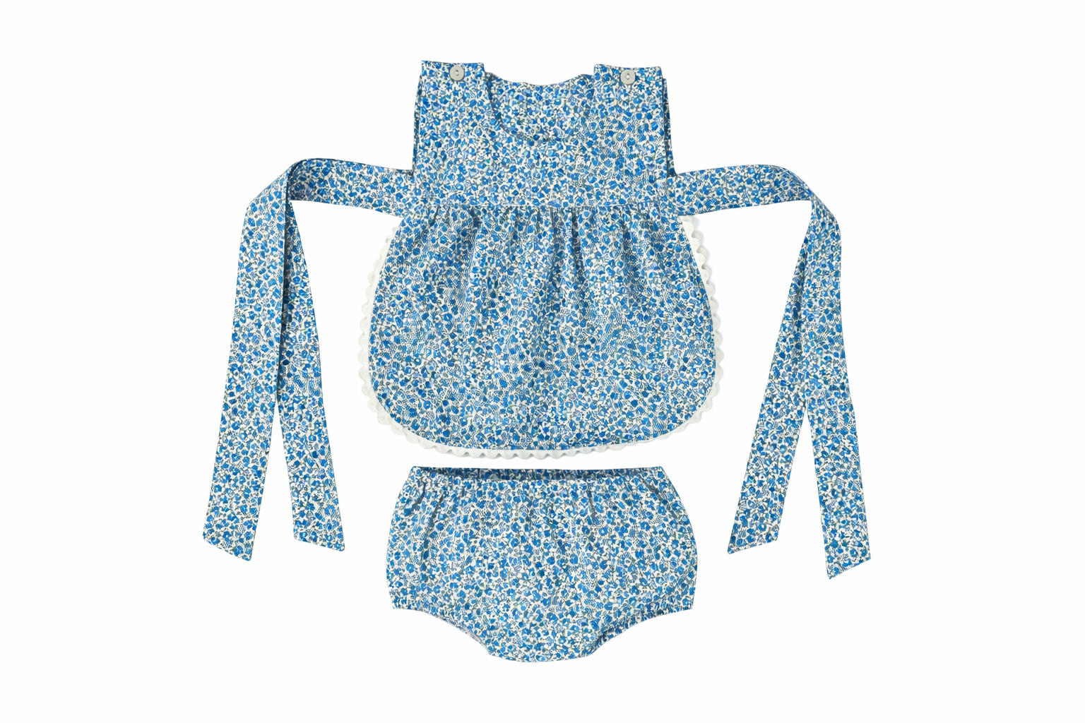 Crafted from soft, breathable cotton, this two-piece set is designed for baby girls, keeping them comfortable and stylish throughout the summer. The set includes a top with delicate picunela trimming and long sides that tie into a charming bow for an adjustable fit. Paired with a coordinating bloomer made from the same gentle fabric, this outfit offers both elegance and ease of movement. The soft cotton ensures comfort on your baby girl’s delicate skin, while the sweet design adds a touch of grace to any occasion. Made with love in Spain, this set is a must-have for your baby girl’s summer wardrobe.